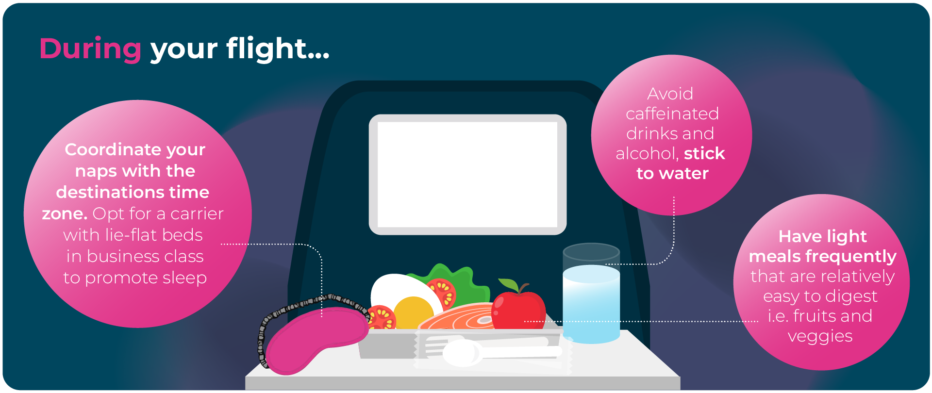 Managing your routine during the flight, including when you sleep, eat, and move, helps limit disruption to your body clock and reduces the severity of jet lag on arrival.