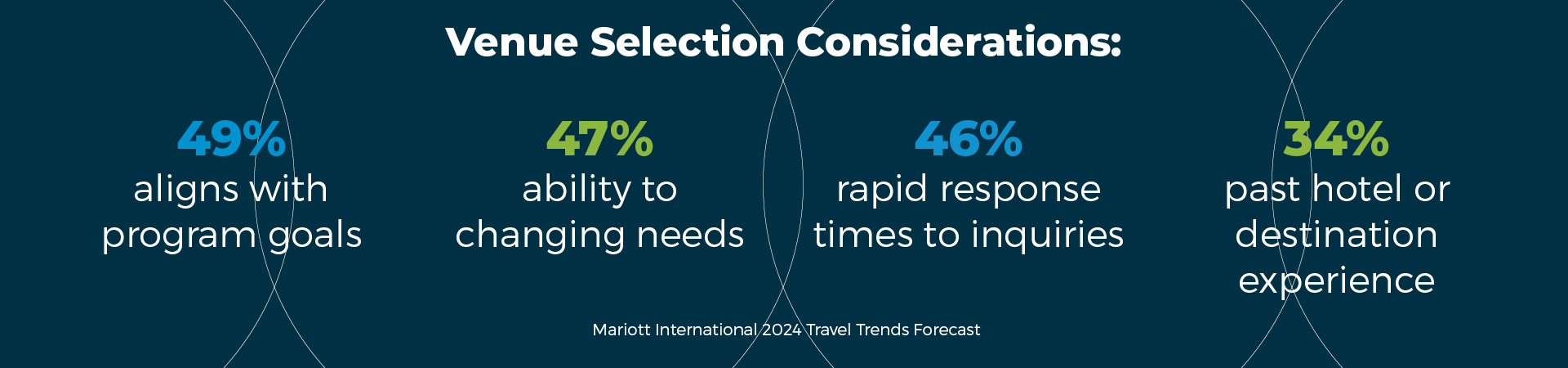 Gone are the days of simply booking accommodation and a venue. Survey findings from Marriott’s travel trend forecast, indicate that for event organizers planning group travel in 2024, key considerations in venue selection will include aligning with evolving program goals (49%), adaptability to changing needs (47%), and rapid response times to inquiries and requests (46%). Notably, only 34% of respondents cited past experiences as a factor in hotel/destination selection, indicating a willingness among event planners to explore new venues that align with current priorities.