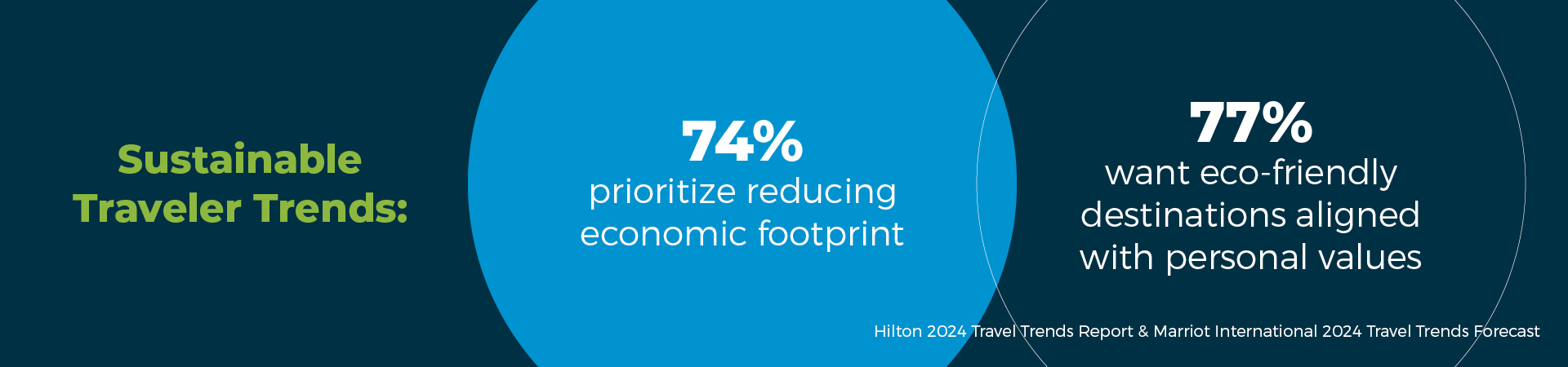Sustainability stands as a main trend in group travel, particularly within the corporate events audience, where an emphasis is placed on minimizing environmental impact. This shift is underscored by data from Hilton’s findings revealing that 74% of travelers prioritize reducing their environmental footprint, while Marriott echoes a similar sentiment, with 77% expressing a desire to explore eco-friendly destinations aligned with their values.