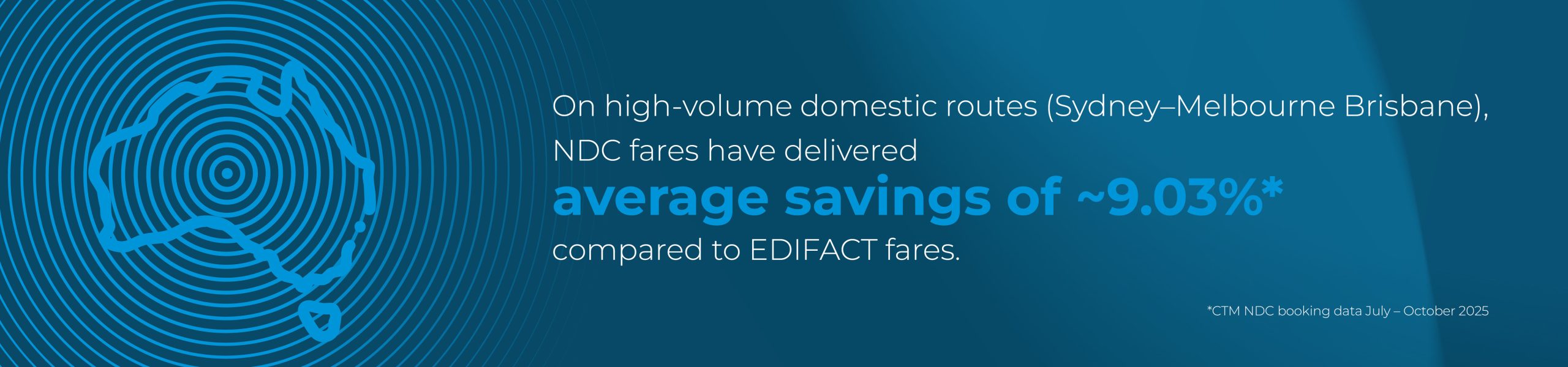 On high-volume domestic routes (Sydney–Melbourne–Brisbane), NDC fares delivered an average ~9.03%* saving compared to EDIFACT.
