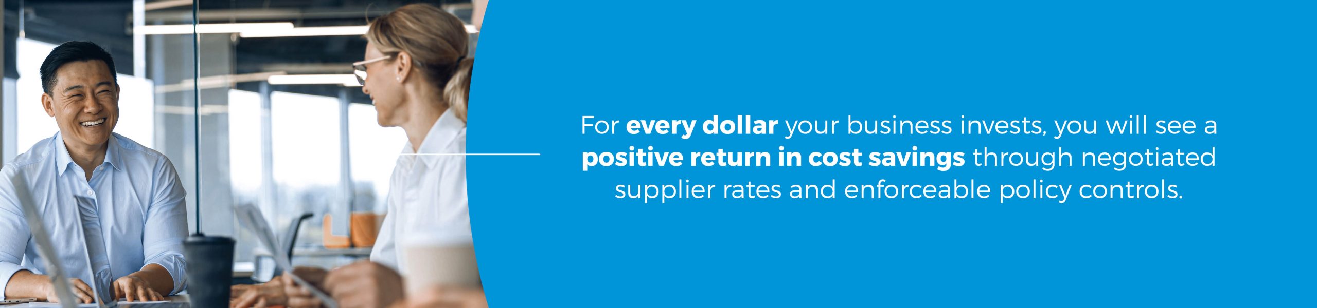 For every dollar your business invests in a TMC-managed travel program, you will see a positive return in cost savings through negotiated supplier rates and enforceable policy controls. If you’re paying more to book and manage your travel than you’re saving, it might be time to talk to an experienced TMC.